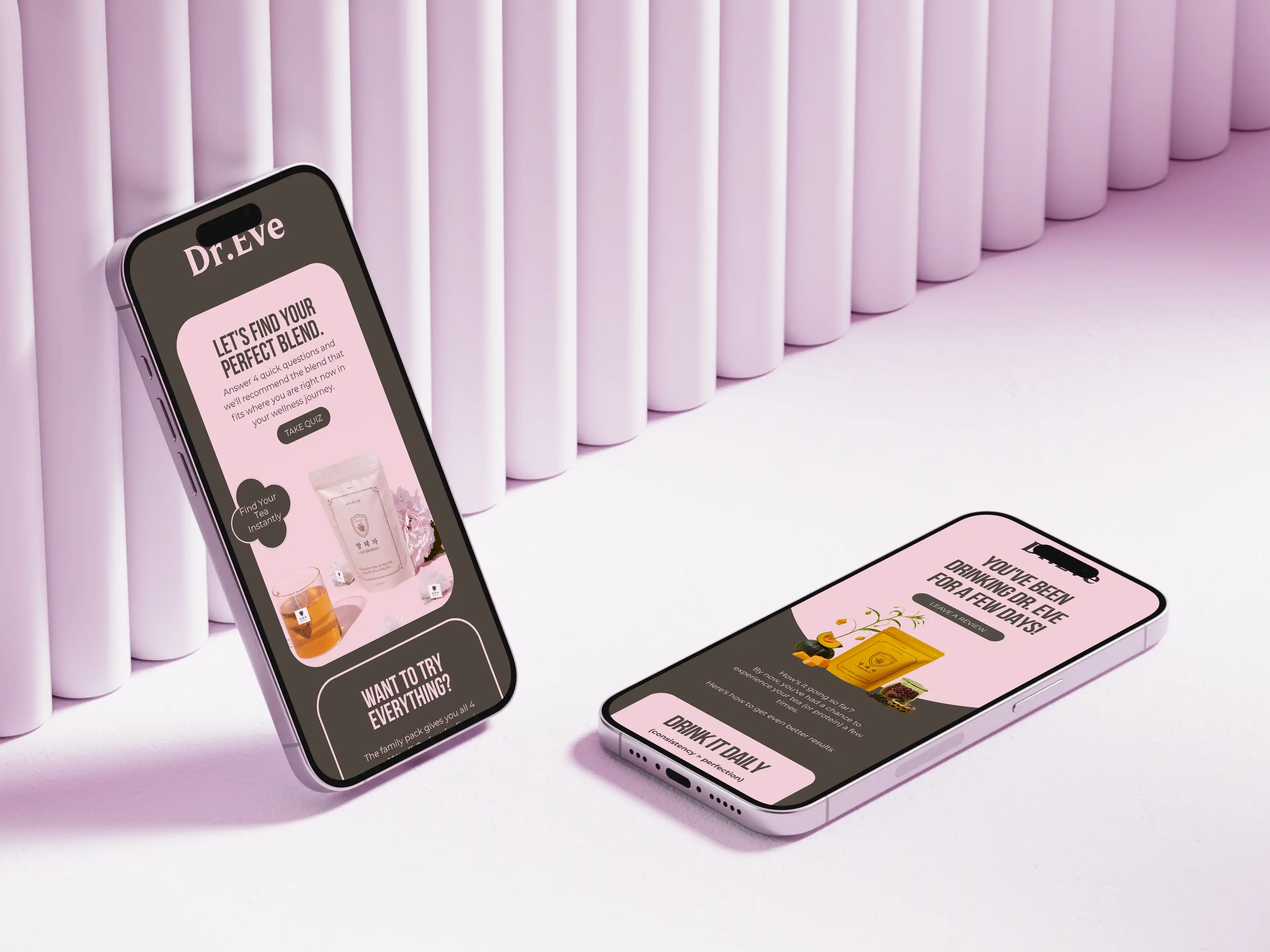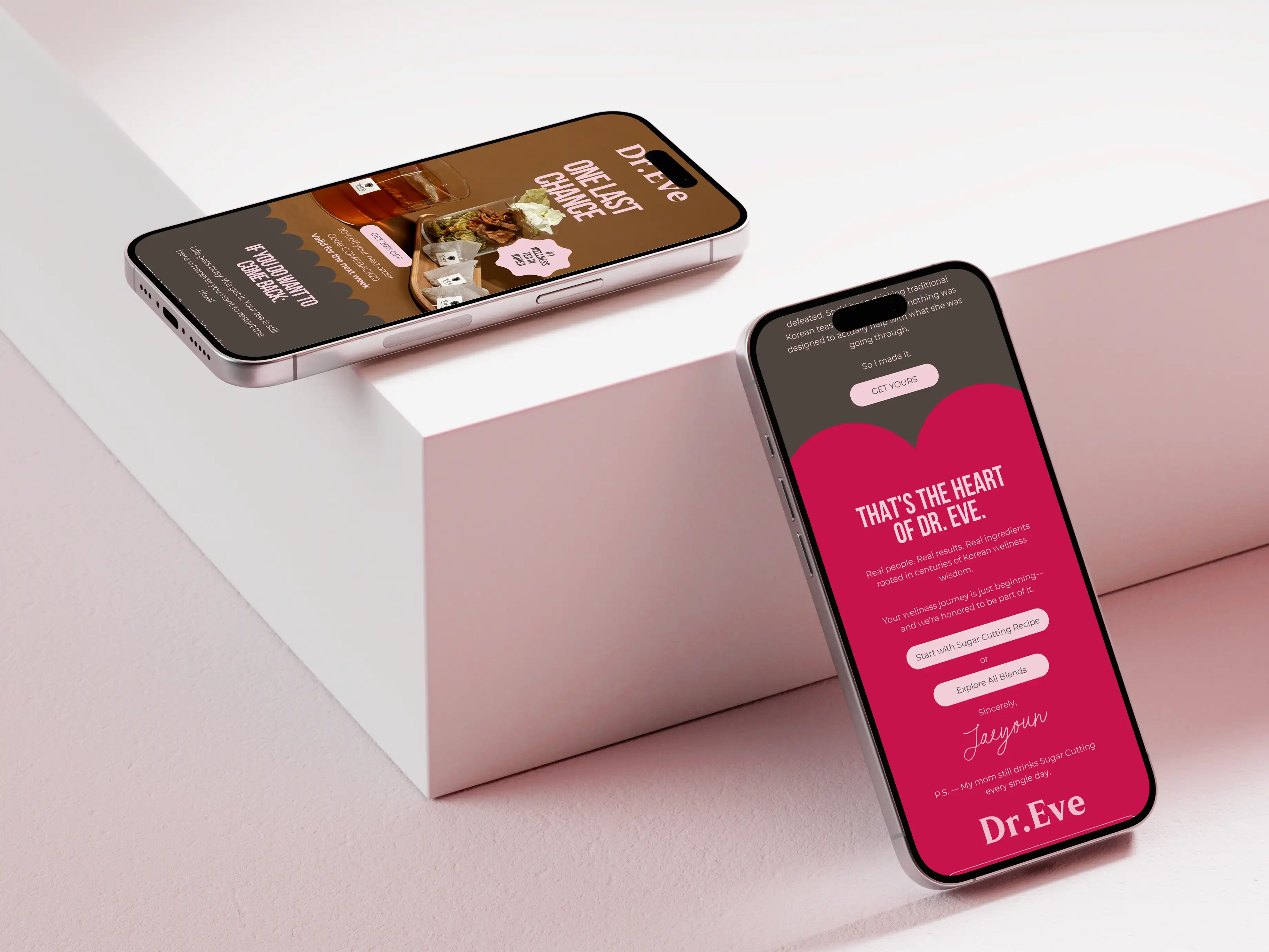 We delivered a full Shopify site with conversion-optimized product pages, collapsible educational tabs, and bold visual identity that refuses to play by wellness category conventions. We staged Klaviyo email flows for welcome, post-purchase, replenishment, and winback — turning one-time buyers into subscribers. We built pop-up flows with personalized product recommendations based on wellness goals. And we created a brand positioning strategy and OOH marketing plan to help Dr. Eve own "Korean functional wellness" in the U.S. and UK markets before larger CPG brands catch on. The site launched ready to convert, retain, and scale.